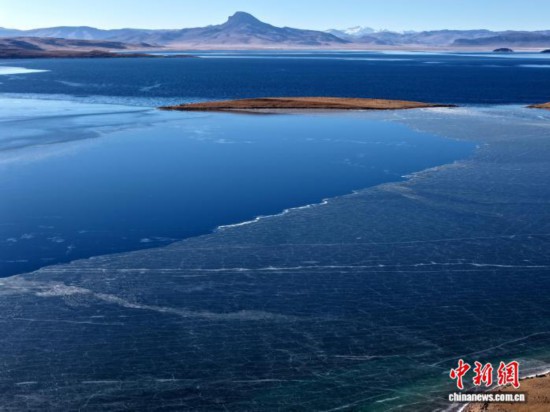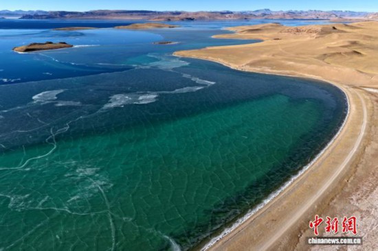 12月20日,航拍错鄂湖。错鄂湖,位于西藏那曲市申扎县境内,是色林错的卫星湖。冬日错鄂湖在阳光照耀下,湖泊呈现蓝、绿等多种颜色,景色迷人。