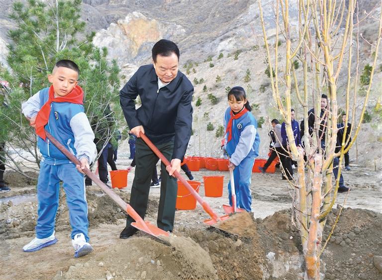 3月31日上午,自治区领导王君正、洛桑江村、严金海、王凯、刘江、汪海洲、赖蛟、嘎玛泽登、达娃次仁等来到位于拉萨市堆龙德庆区东嘎社区造林点,与各族干部群众、少先队员一同义务植树。这是王君正同大家一起植树。